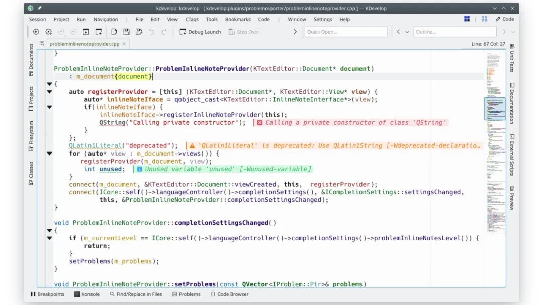 KDevelop 5.6 的更新内容主要侧重于稳定性、性能和将来的可维护性,许多现有的功能也再次得到了一些小改进。其中一个值得关注的新功能是支持在代码行结束处以“行内注释(inline notes)”的样式显示问题。
